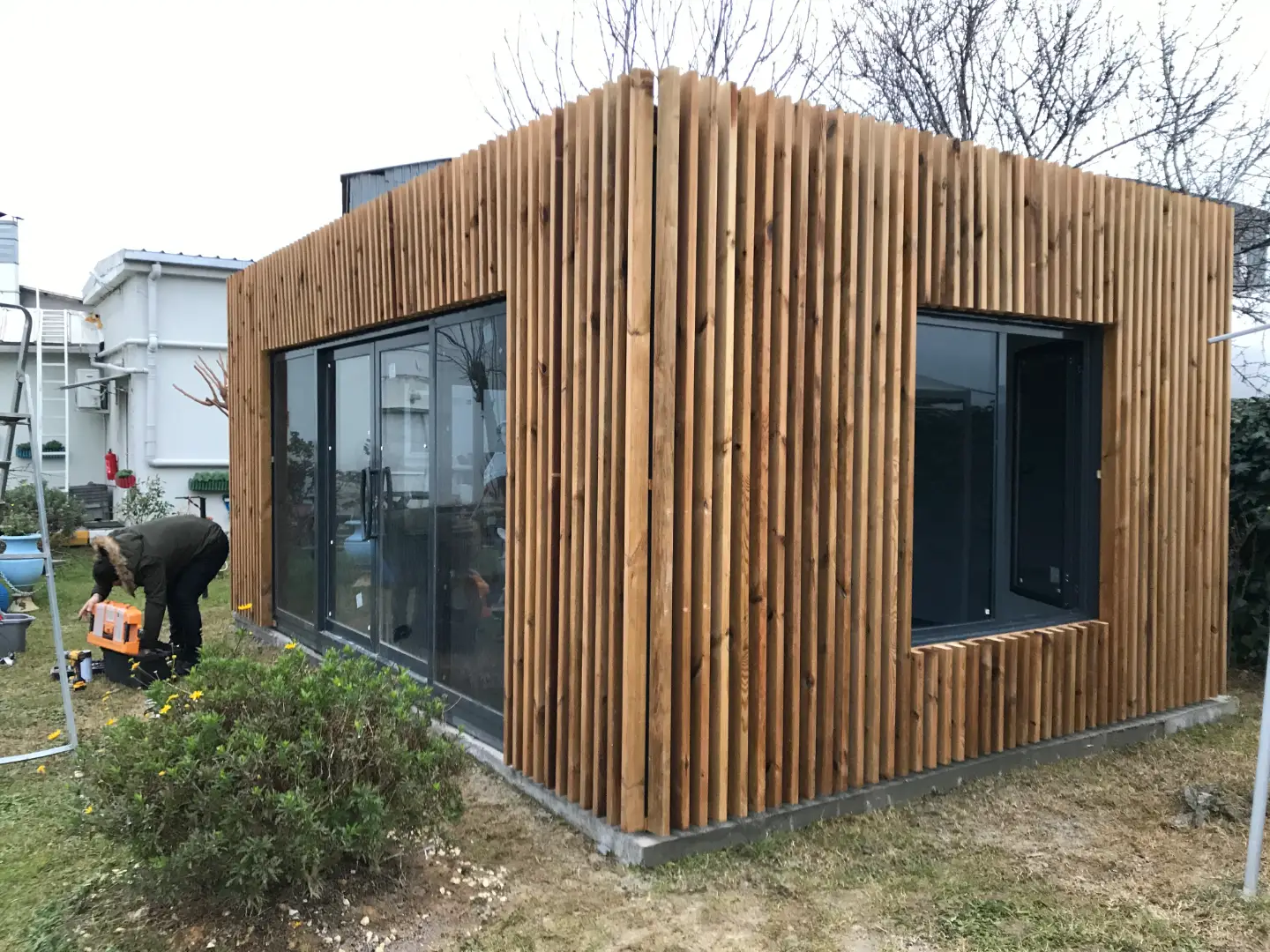 - DOĞAL AHŞAP KAPLAMA TAŞINABİLİR EV KONTEYNER 30 M2